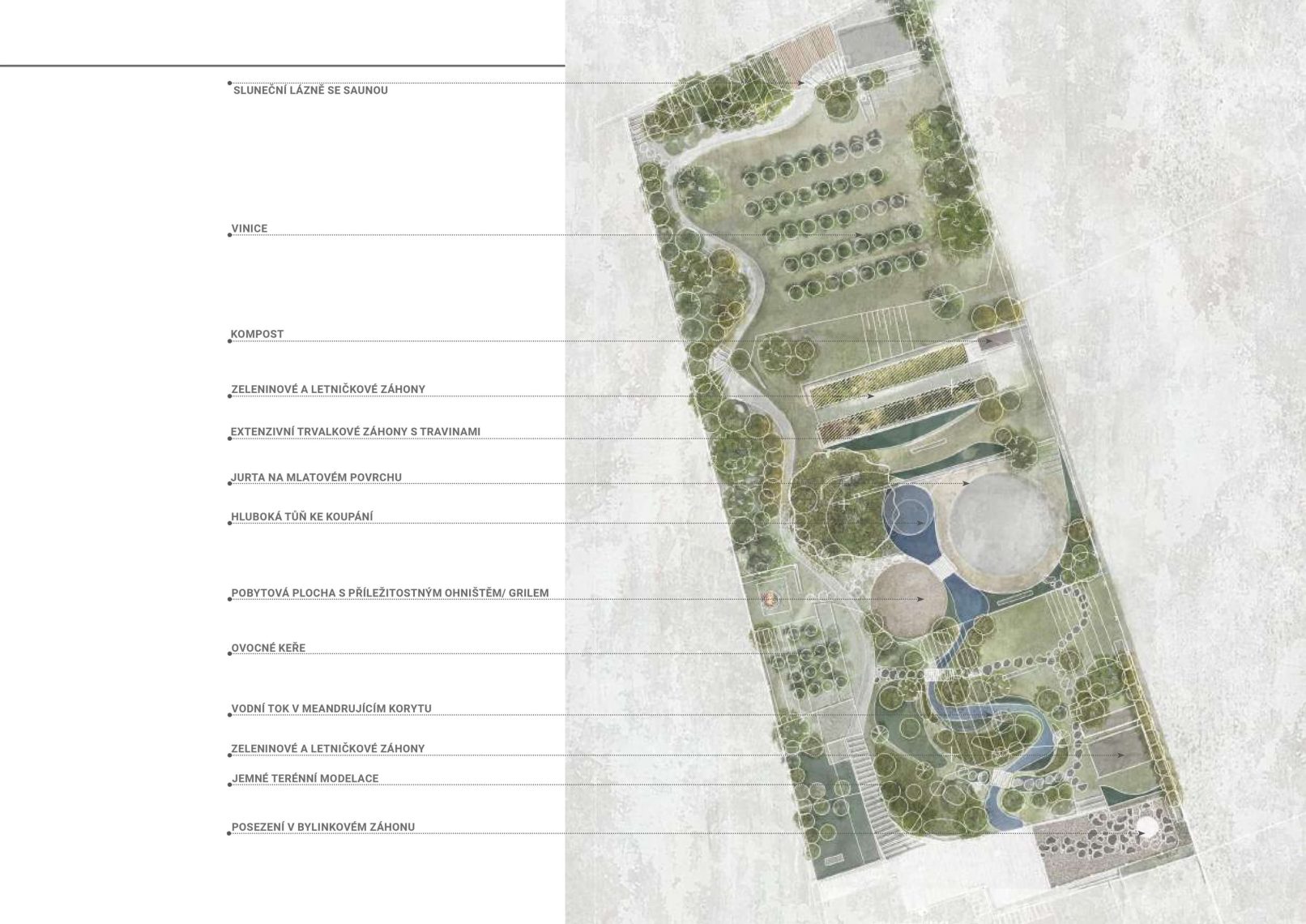 Within the submitted project documentation, including the terraced plot located behind the family villa, it continues the layout of the steep plot implemented by the original owners, but with a new concept based on the requirements of the current owners. On the modified individual terraces, connected by a rising walkway, individual composed parts are thematically situated, taking into account their location and size, starting with sitting in a herb garden with vegetable and perennial beds, followed by an ornamental part, a terrace with small fruits and a connected living area with a fireplace, barbecue , swimming pool and yurt. This is followed by other flower and vegetable beds, a revitalized vineyard, fruit trees and, at the highest point, a sun bath with a sauna. The main function of the design is to create an intimate, peaceful place with a significant potential for biological activity, where the planted plants together with terrain modeling and water or other architectural elements will create a biologically and aesthetically friendly location with all the required active or passive functions.