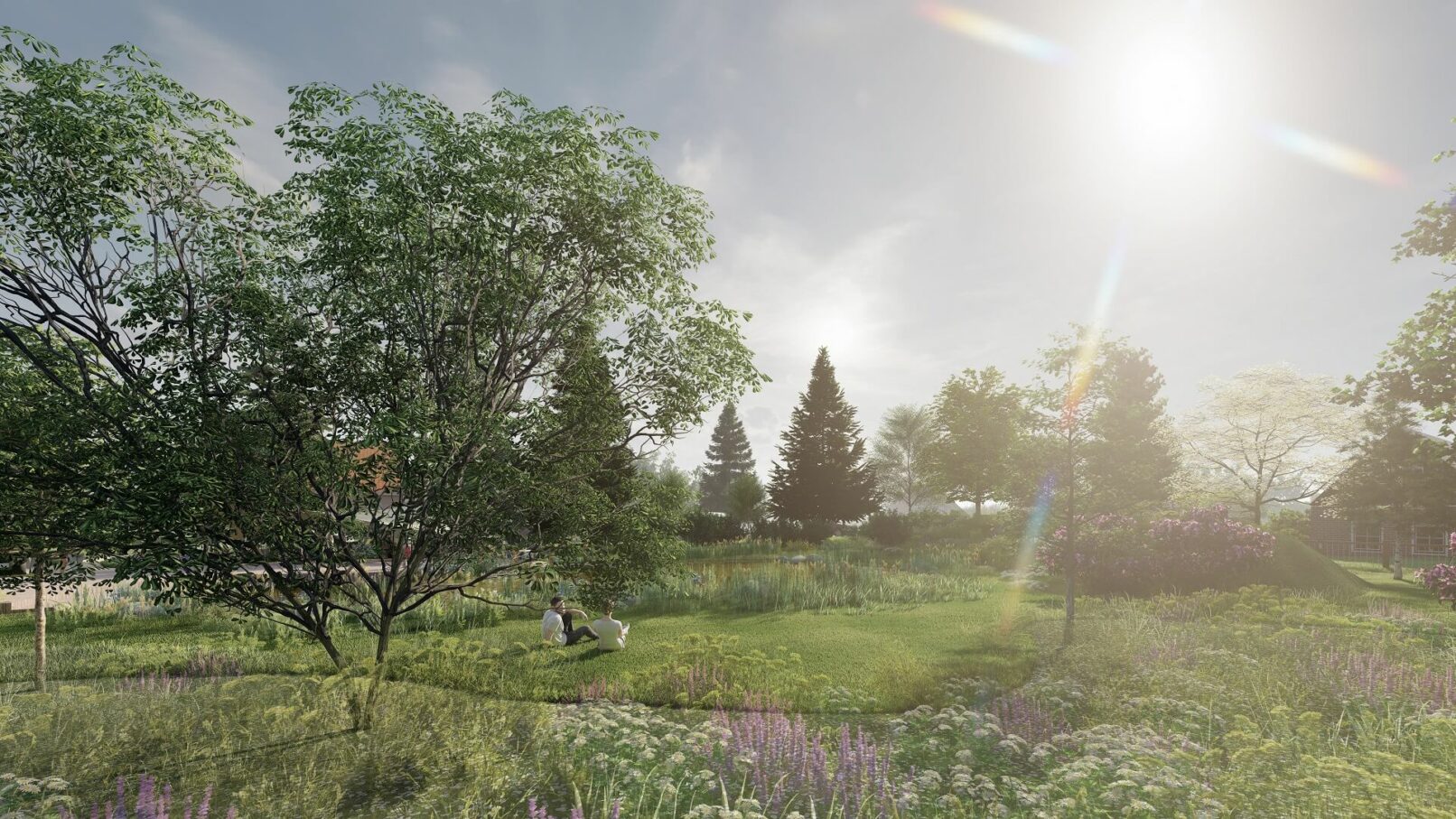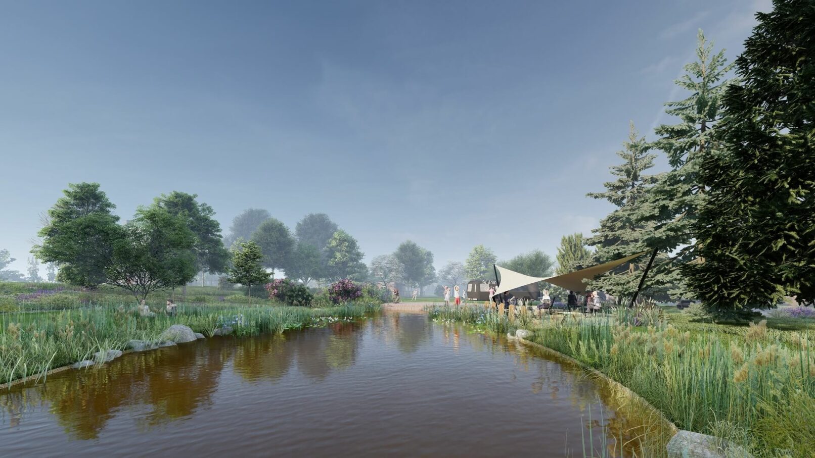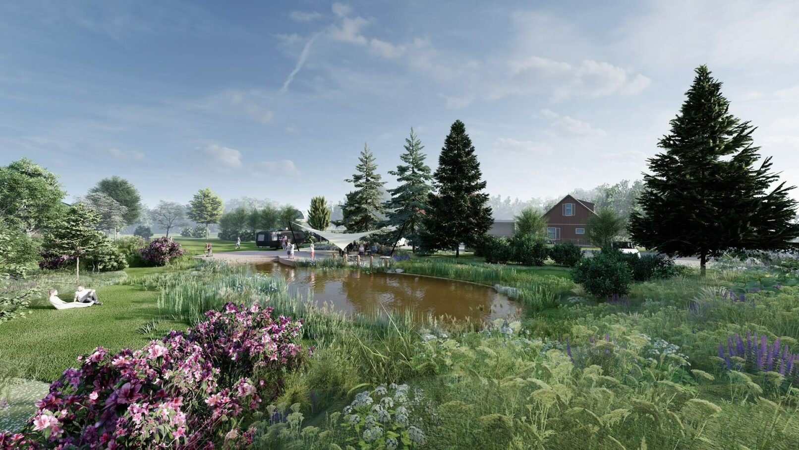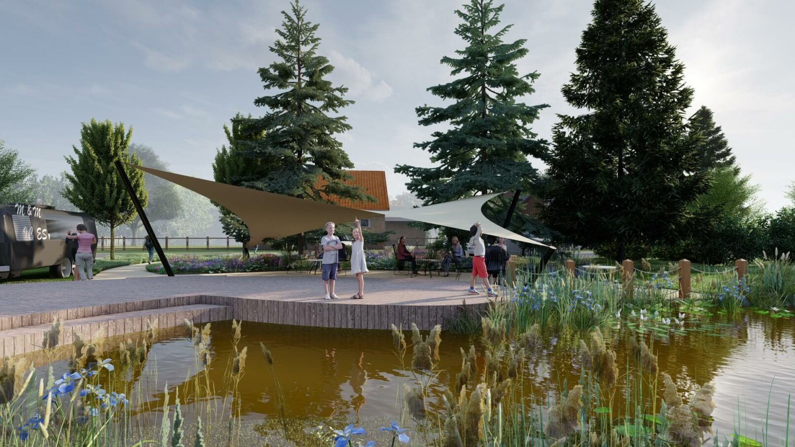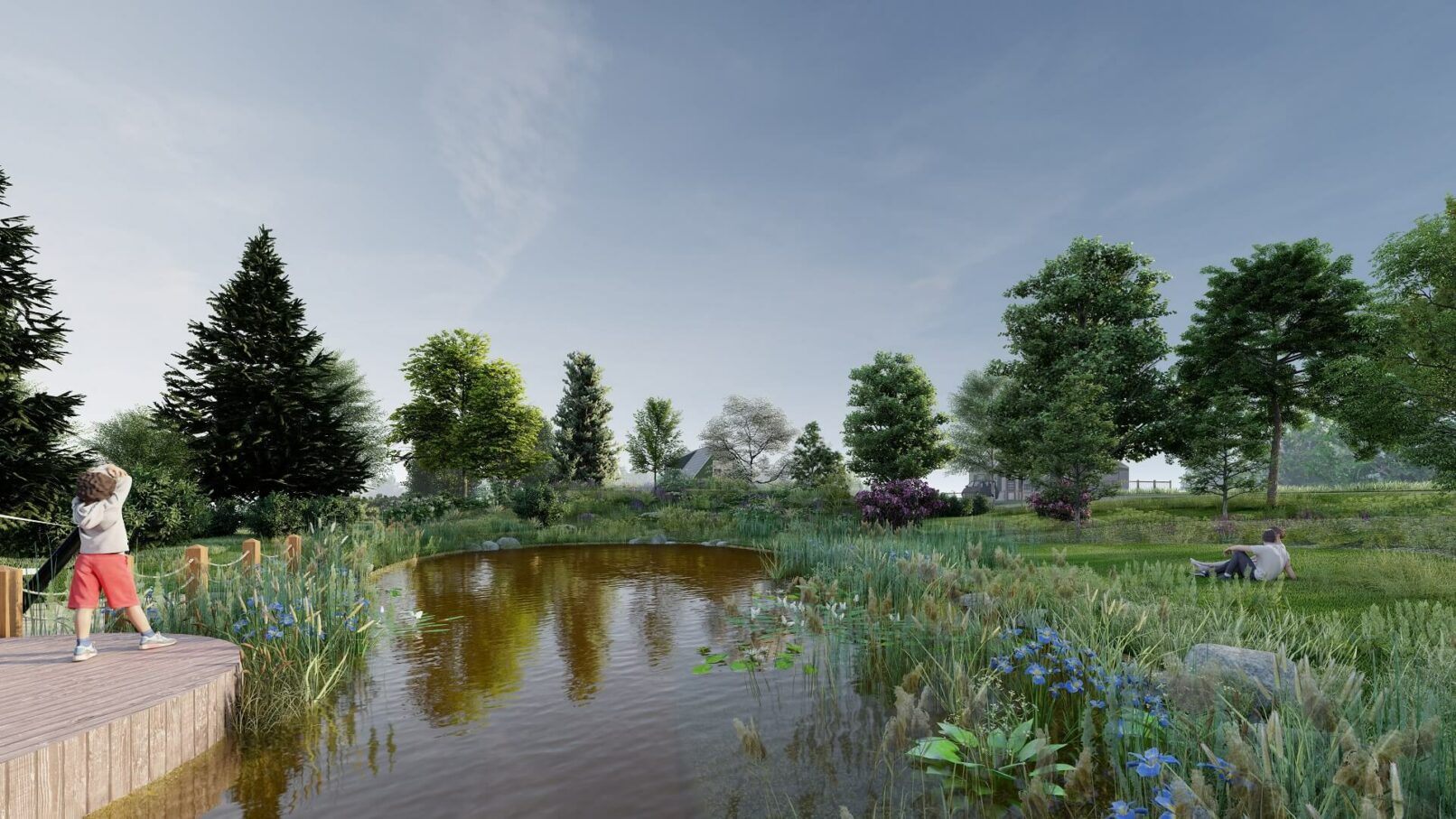 Uvedený návrh řeší revitalizaci stávající nádrže spojené s celkovým společenským využitím daného prostoru v rámci kompozice dotčené části obce s přiléhajícími plochami navazujícími na okolní urbanistické a přírodní struktury. Studie vychází z určitých historických souvislostí, místních prostorových, klimatických, půdních i biologických podmínek, zasazených do daného reliéfního rámce a informačních souvislostí. Celý řešený areál je na základě filozofie řešení veřejného prostoru rozdělen do několika přirozeně na sebe navazujících sektorů počínaje nově vytvořeným vodním biotopem s příslušnou litorální částí, modelacemi v jeho okolí s bohatými květnatými či pobytovými loukami a výsadbami dřevin (stromy, keře), kulturně společenským prostorem zahrnujícím stávající dětské hřiště, dřevěné molo s pobytovými schody i místem k posezení u mobilního občerstvení a určitým technickým zázemím v podobě přístupové cesty a parkoviště. Stávající betonová nádrž bude provedenými lehkými vestavbami změněna na přirozený organický tvar vodní hladiny (režim napouštění vody bude zachován) a zbývající části stávající nádrže budou využity jako pobřežní zóny s vegetací, zábradlí bude zrušeno a hrany nádrže budou přirozeně zakomponovány. V místě stávajícího vstupu do nádrže a na navazující ploše bude vybudováno dřevěné molo s pobytovým schodištěm pro organizování celospolečenských akcí na které bude navazovat přistíněný prostor (např. dřevo, plátěné plachty) uzpůsobený k příjemnému posezení se sezónním mobilním občerstvením. Svah nad nádrží bude protažen a domodelován tak, aby zde byly přirozeně odděleny prostory aktivního pobytu od klidových míst využívaných k piknikům i slunění a přirozených luk s plnou škálou travobylinných společenstev (kvetoucí louky) doplněné stromovým a keřovým patrem. Přístup do areálu bude zajištěn zpevněnou (mlatovou) cestou a podél komunikace bude vybudováno „zelené“ parkoviště (zatravňovací dlaždice, pásy).